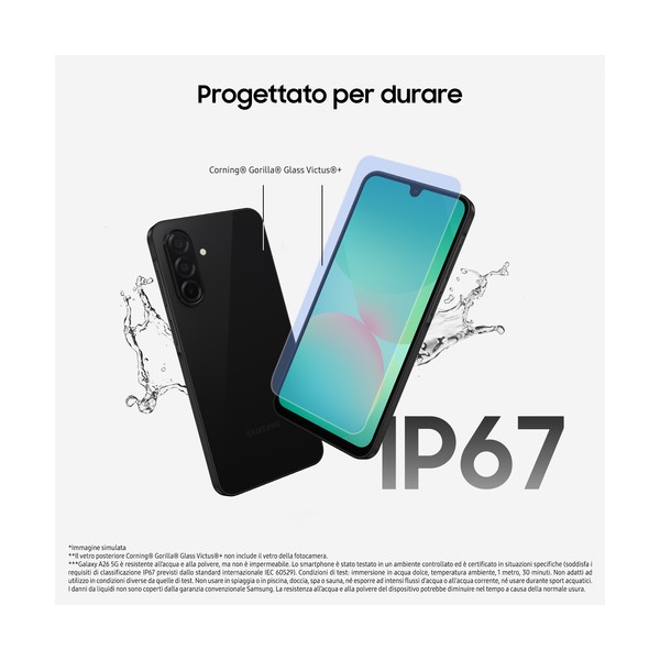 Svolgi le tue attività preferite all'aperto in tutta tranquillità. Galaxy A26 5G è dotato della certificazione IP67 per la resistenza alla polvere e all'acqua: potrai usarlo per immortalare momenti indimenticabili durante concerti o partite, anche sotto la pioggia.
