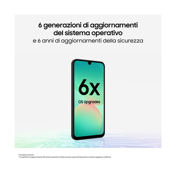 Non perderti gli ultimi aggiornamenti, con 6 generazioni di aggiornamenti del sistema operativo e 6 anni di aggiornamenti della sicurezza per mantenere il tuo Galaxy A26 5G sicuro e performante.