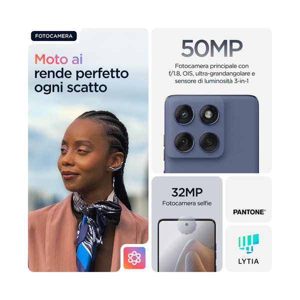 • Foto straordinarie con tecnologia Sony LYTIA™. Scatta foto di livello professionale grazie al sensore Sony LYTIA™ 700C e alla stabilizzazione ottica dell'immagine, perfettamente integrati con Moto AI