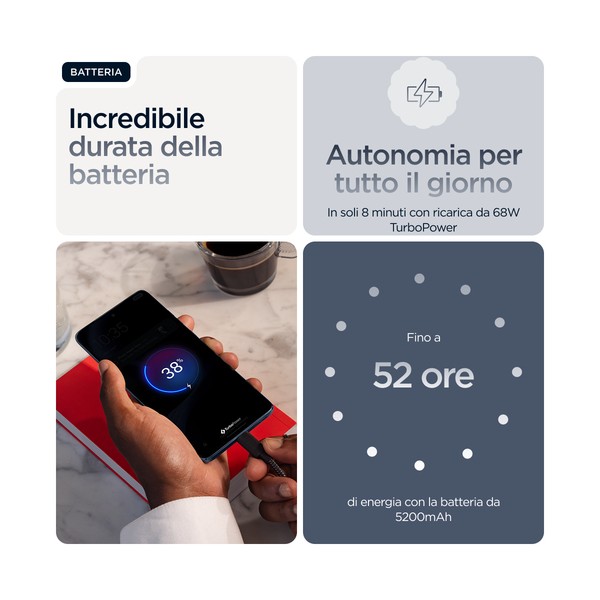 • Batteria con autonomia per l'intera giornata in soli 8 minuti4. Ricarica lo smartphone con meno interruzioni grazie alla stupefacente velocità della ricarica TurboPower™ da 68 W
