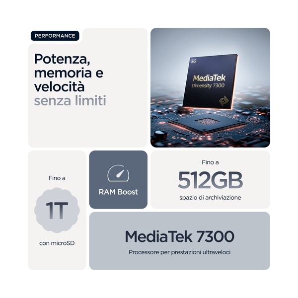 • Prestazioni eccezionali. Insegui le tue passioni senza interruzioni grazie al chipset ultraveloce MediaTek Dimensity 7300 e RAM fino a 8 GB. 8