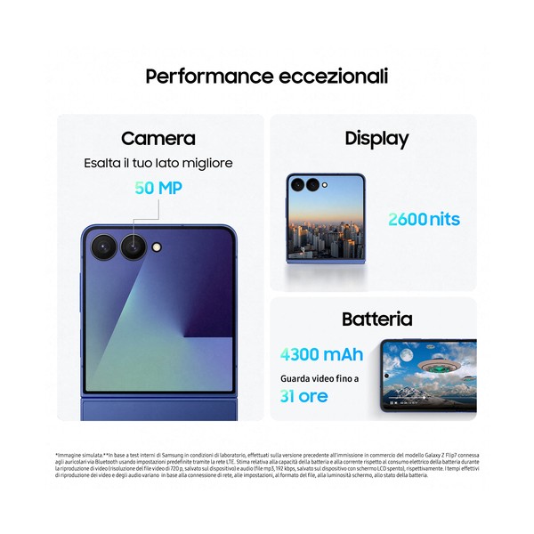Ti presentiamo il Galaxy Z Flip più sottile, più resistente e più avanzato di sempre: bellezza e prestazioni senza pari che si adattano perfettamente al tuo stile di vita e alle tue tasche. Il display esterno ampliato è spettacolare da un bordo all'altro, e il tutto è racchiuso in un corpo resistente più sottile sia da chiuso sia da aperto.