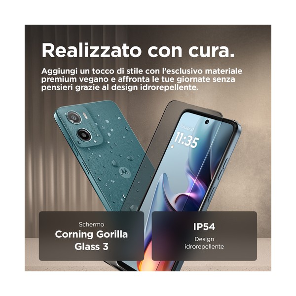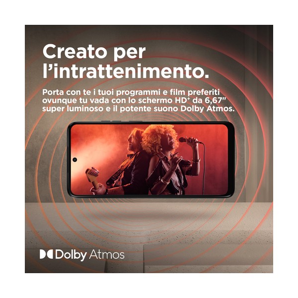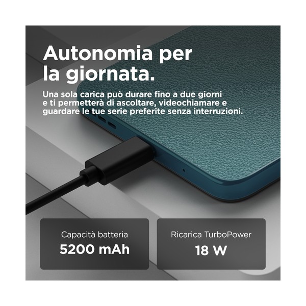 Foto più nitide per storie straordinarie. Goditi immagini e audio mozzafiato con il nuovo Moto g05. Guarda i tuoi spettacoli e film preferiti su uno schermo sorprendentemente luminoso da 6,67" anche all'aperto sotto la luce del sole. E ascolta un audio avvolgente grazie ai potenti altoparlanti stereo con Amplificazione bassi. Scatta foto straordinariamente nitide sia di giorno che di notte con il sistema di fotocamera Quad Pixel da 50 MP(2) dotato di funzionalità Ritratto basata sull'AI. Incrementa la tua velocità con performance ultra-efficienti e fino a 24 GB di RAM disponibili con Estensione RAM(5). Grazie a una finitura in materiale premium vegano(4) e a Corning® Gorilla® Glass 3, Moto g05 regala uno stile intramontabile. Conta sulla straordinaria autonomia offerta dalla batteria da 5200 mAh e sulla ricarica TurboPower™. E ottieni tantissimo spazio di archiviazione per conservare i tuoi contenuti e le tue creazioni. Moto g05 è sorprendente sotto ogni aspetto.