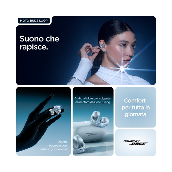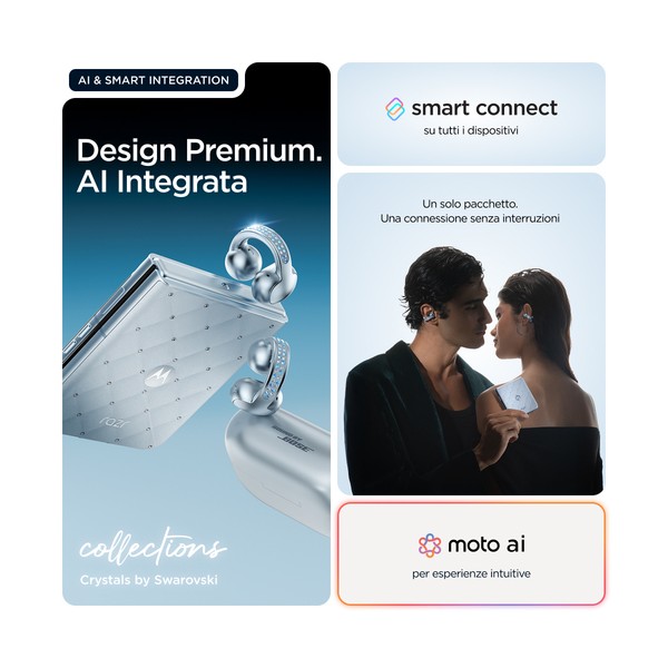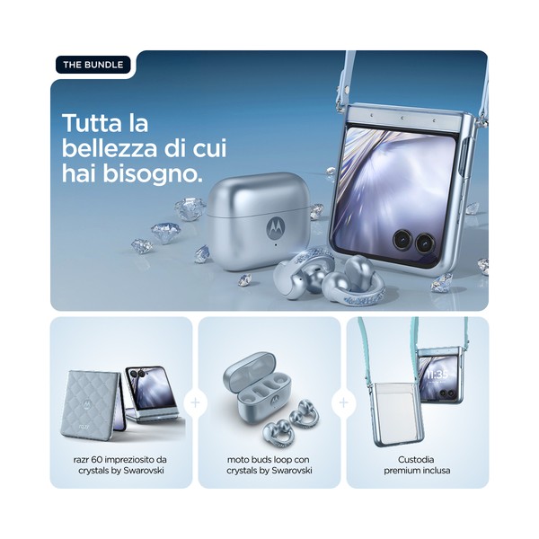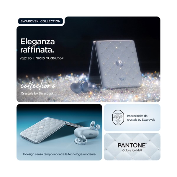 Brillantezza combinata La Brilliant Collection unisce motorola razr e moto buds loop con Swarovski crystals®, in una splendente dimostrazione di come moda e funzionalità possano brillare in perfetta armonia. Motorola razr è sinonimo di meticolosa maestria e lusso senza tempo. Ad accompagnare questo iconico smartphone, le moto buds loop, auricolari aperti che sono una vera opera d'arte. Sia le moto buds Loop che motorola razr condividono l'affascinante colore PANTONE Ice Melt, una tonalità rinfrescante che evoca nitidezza e innovazione silenziosa. Insieme, offrono un mix perfetto di design straordinario e prestazioni avanzate, pensato per migliorare il tuo look, le tue sensazioni e la tua connettività quotidiana. E la custodia a tracolla di qualità offre sicurezza ed eleganza.