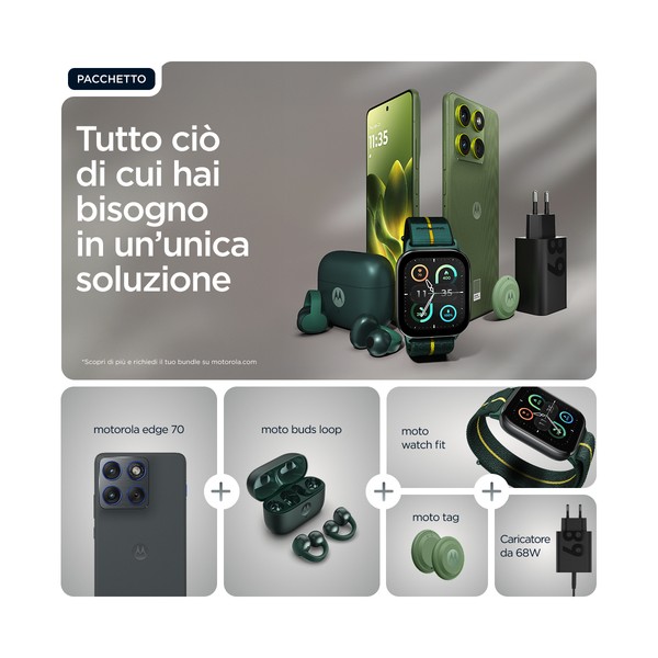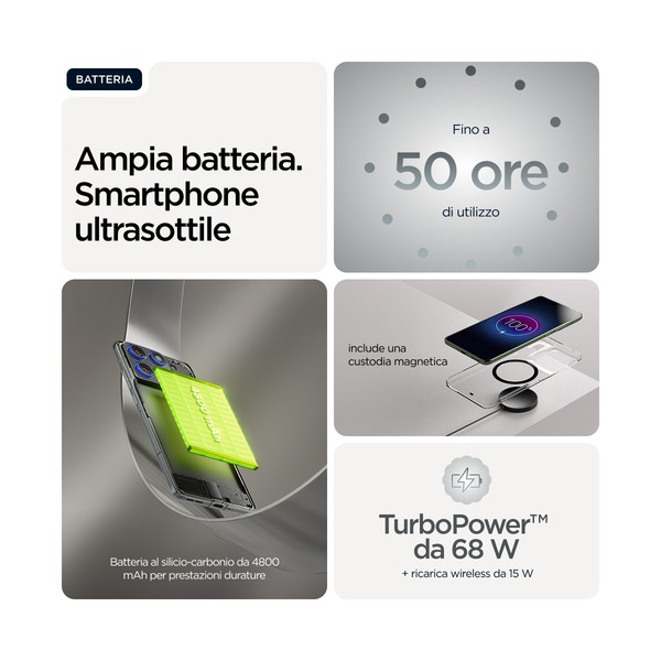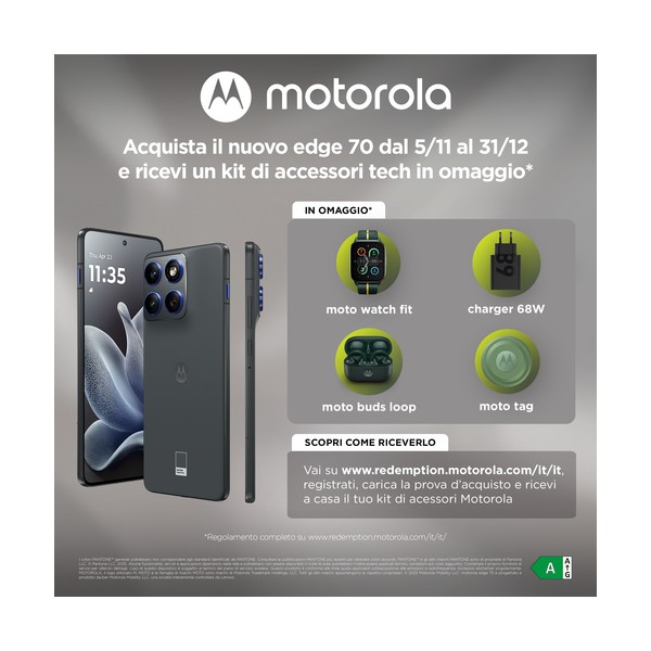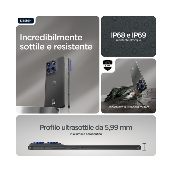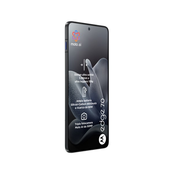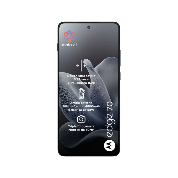 Ti presentiamo Motorola Edge 70, dal design ultra sottile 5.99mm e ultra leggero 159g con protezione avanzata Military Standard e resistenza IP68 e IP69. Scatta immagini eccezionali grazie al sistema di fotocamere da 50 MP OIS e ultragrandangolare. Goditi i contenuti sull’ampio display Super HD da 6,67”. La ricarica TurboPower™ da 68W fornisce autonomia rapidamente. Prova performance rapide ed efficienti con la batteria Silicon-Carbon da 4800mAh e il processore Qualcomm Snapdragon® 7 Gen 4. Con 12GB di RAM e 512GB di memoria.
