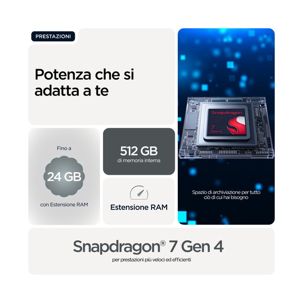 Potente e leggero. Sperimenta le prestazioni ultra-fluide di Snapdragon® 7 di 4ª generazione e fino a 512 GB di spazio per archiviare le tue creazioni.13