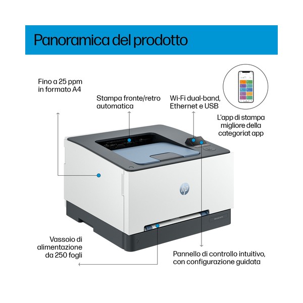 Qualità e affidabilità per la stampa wireless a colori. Progettata per gruppi di lavoro che necessitano di una stampante laser dalle prestazioni elevate, che offra la possibilità di stampare rapidamente documenti fronte/retro a colori. Il tutto in un dispositivo compatto con qualità e affidabilità HP.[11]