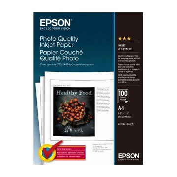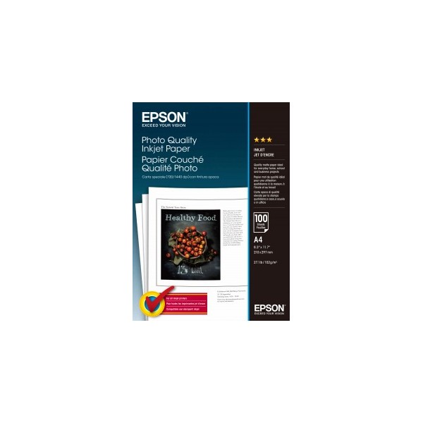 Epson Photo Quality Inkjet Paper - A4 - 100 Fogli. Colore del prodotto: Bianco, Tipo rifinitura: Opaco, Peso medio: 102 g/m². Quantità per pacco: 1 pezzo(i), Larghezza imballo: 220 mm, Profondità imballo: 310 mm. Larghezza del pallet (UK): 100 cm, Lunghezza del pallet (Regno Unito): 120 cm, Altezza del pallet (UK): 122 cm. Larghezza: 210 mm, Altezza: 297 mm. Paese di origine: Giappone