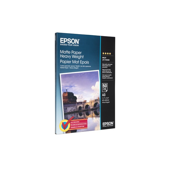 Epson Carta speciale opaca "matte" alto spessore. Utilizzo raccomandato: Stampa inkjet, Dimensioni foglio: A3 (297x420 mm), Tipo rifinitura: Opaco. Larghezza imballo: 310 mm, Profondità imballo: 430 mm, Altezza imballo: 20 mm. Larghezza del pallet (UK): 100 cm, Lunghezza del pallet (Regno Unito): 120 cm, Altezza del pallet (UK): 120 cm. Quantità per pallett: 300 pezzo(i), Paese di origine: Giappone, Quantità per pacco: 1 pezzo(i)