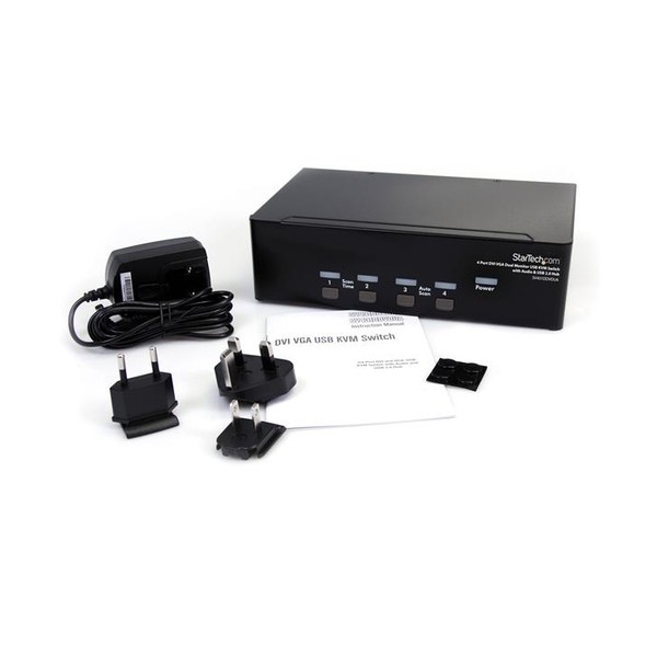 Lo switch KVM per doppio monitor (DVI+VGA) a 4 porte SV431DDVDUA offre una soluzione completa di commutazione multimediale, per gestire quattro computer dotati di Dual Display, a partire da una singola postazione USB comprendente mouse e tastiera. Lo switch KVM doppio monitor offre una porta VGA (analogica) e una porta DVI-I per connessione per video ad alta risoluzione, nonché funzionalità di commutazione audio tra computer collegati. Lo switch DVI/VGA KVM è dotato di hub USB a 2 porte integrato per condividere periferiche con interfaccia USB 2.0 tra i computer collegati. Offre un design compatto ed è dotato di resistente case in metallo che consente di garantire prestazioni durature. NOTA: benché la postazione KVM supporti sia i segnali DVI-I (analogico) e DVI-D (digitale), i PC sorgente devono supportare lo stesso tipo di segnale per effettuare la commutazione. Si raccomanda laddove possibile di utilizzare cavi DVI-D per tutte le connessioni PC a KVM e KVM a postazione. Se necessario, contattare l'assistenza tecnica per richiedere supporto nell'individuare il tipo di sorgenti. Con garanzia StarTech.com di 3 anni e supporto tecnico gratuito a vita. Consente di montare uno switch KVM in un rack Per montare questo switch KVM in un server rack, StarTech.com offre una staffa 1U per montaggio in rack (venduta separatamente).
