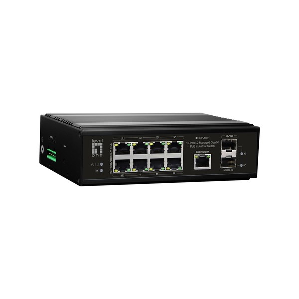 LevelOne IGP-1061. Tipo interruttore: Gestito, Livello del commutatore: L2. Tipo di porte RJ-45: Gigabit Ethernet (10/100/1000), Quantità di porte RJ-45: 8, Quantità di moduli SFP installati: 2, Console port: RJ-45. Dimensioni tavola MAC: 8000 voci. Standard di rete: IEEE 802.3, IEEE 802.3ab, IEEE 802.3af, IEEE 802.3at, IEEE 802.3bt, IEEE 802.3u, IEEE 802.3x, IEEE.... Voltaggio input DC: 48 - 57 V. Supporto Power over Ethernet (PoE)