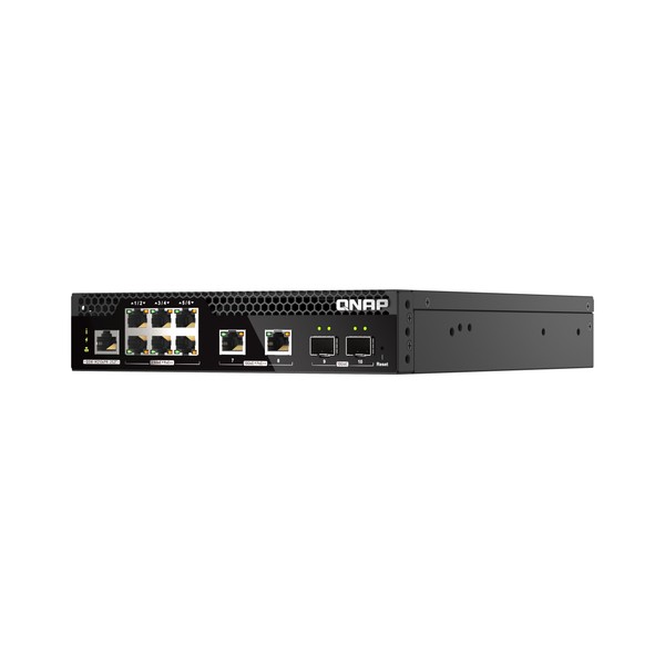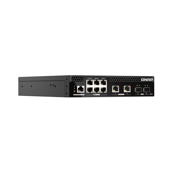 QNAP QSW-M2106PR-2S2T. Tipo interruttore: Gestito, Livello del commutatore: L2. Tipo di porte RJ-45: 10G Ethernet (100/1000/10000), Quantità di porte RJ-45: 2, Quantità di moduli SFP+ installati: 2, Console port: RJ-45. Dimensioni tavola MAC: 16000 voci, Capacità di commutazione: 110 Gbit/s. Standard di rete: IEEE 802.1Q, IEEE 802.1ab, IEEE 802.3, IEEE 802.3ab, IEEE 802.3ad, IEEE 802.3ae, IEEE 802.3af,.... Supporto Power over Ethernet (PoE). Montaggio rack, Fattore di forma: 1U