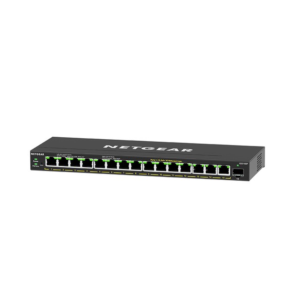 Netgear GS316EP-100PES. Tipo interruttore: Gestito. Quantità di moduli SFP installati: 1. Full duplex. Dimensioni tavola MAC: 4000 voci, Capacità di commutazione: 28 Gbit/s. Standard di rete: IEEE 802.3,IEEE 802.3ab,IEEE 802.3af,IEEE 802.3at,IEEE 802.3u,IEEE 802.3x. Supporto Power over Ethernet (PoE)