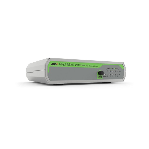 Allied Telesis FS710/5. Tipo interruttore: Non gestito. Tipo di porte RJ-45: Fast Ethernet (10/100), Quantità di porte RJ-45: 5. Full duplex. Dimensioni tavola MAC: 2000 voci, Capacità di commutazione: 1 Gbit/s. Standard di rete: IEEE 802.3,IEEE 802.3az,IEEE 802.3u,IEEE 802.3x. Montabile a parete