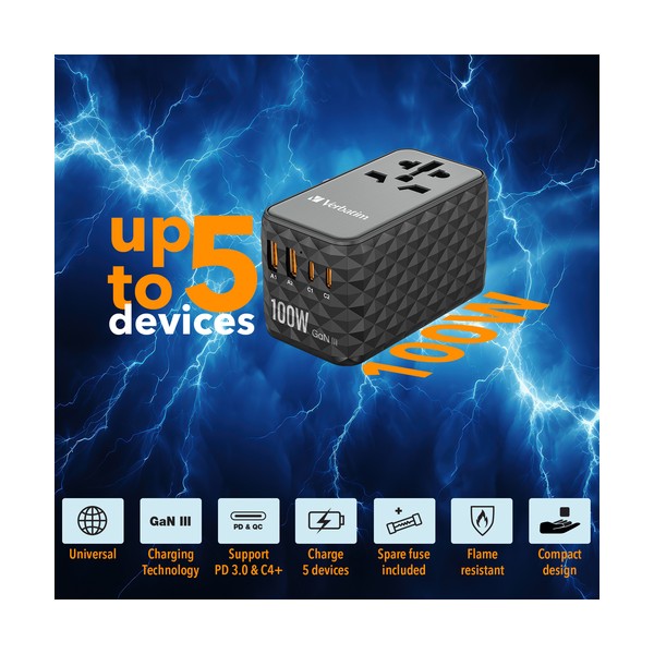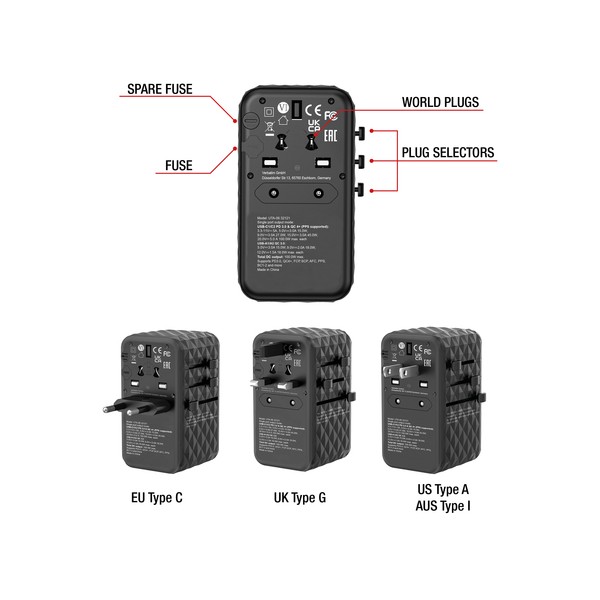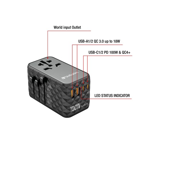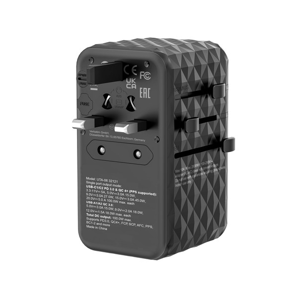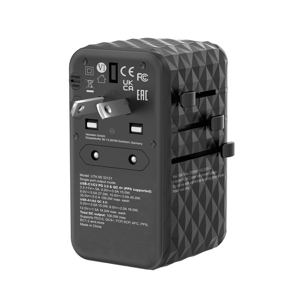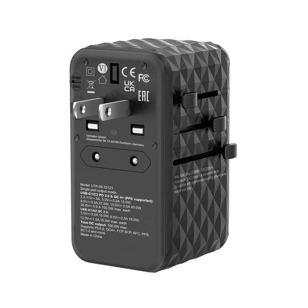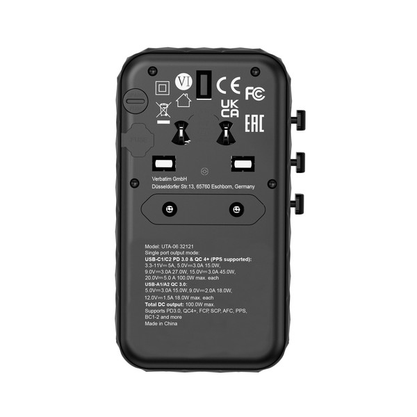 Verbatim 32121, Universale, Universale, Dritto, Tipo A, Tipo B, Tipo C (Europlug), Tipo E (FR), Tipo F, Tipo G (UK), Tipo I (AU), Tipo J (CH),..., Tipo A, Tipo B, Tipo C, Tipo D (UK), Tipo E (FR), Tipo F, Tipo G (UK), Tipo H (IL), Tipo I (AU),..., 100 - 250 V