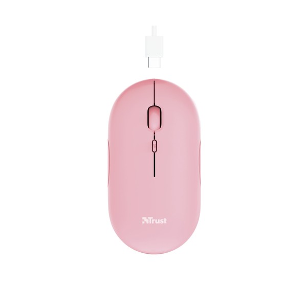 Trust Puck. Fattore di forma: Ambidestro. Tecnologia di rilevamento del movimento: Ottico, Interfaccia dispositivo: Wireless a RF + Bluetooth, Risoluzione movimento: 1600 DPI, Tipo di pulsanti: Tasti premuti, Numero di tasti: 4, Tipo di scorimmento: Rotella. Alimentazione: Batterie. Colore del prodotto: Rosa