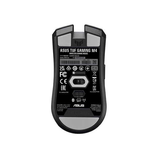 ASUS TUF Gaming M4 Wireless. Fattore di forma: Mano destra. Tecnologia di rilevamento del movimento: Ottico, Interfaccia dispositivo: Wireless a RF + Bluetooth, Risoluzione movimento: 12000 DPI, Tipo di pulsanti: Tasti premuti, Numero di tasti: 6, Tipo di scorimmento: Rotella. Alimentazione: Batterie. Colore del prodotto: Nero
