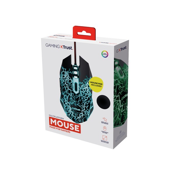 Trust 24752. Fattore di forma: Ambidestro. Interfaccia dispositivo: USB tipo A, Risoluzione movimento: 4000 DPI, Tipo di pulsanti: Tasti premuti, Numero di tasti: 6, Tipo di scorimmento: Rotella. colore d'illuminazione: Multi. Alimentazione: Cavo. Colore del prodotto: Nero