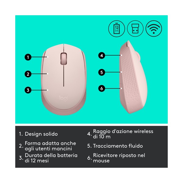 ● Connessione Plug-and-Play: Collega il mouse wireless al computer tramite il ricevitore USB Logitech robusto e affidabile, che si collega alla porta USB del computer