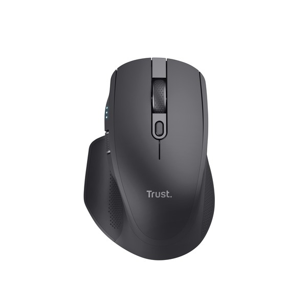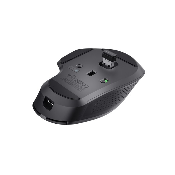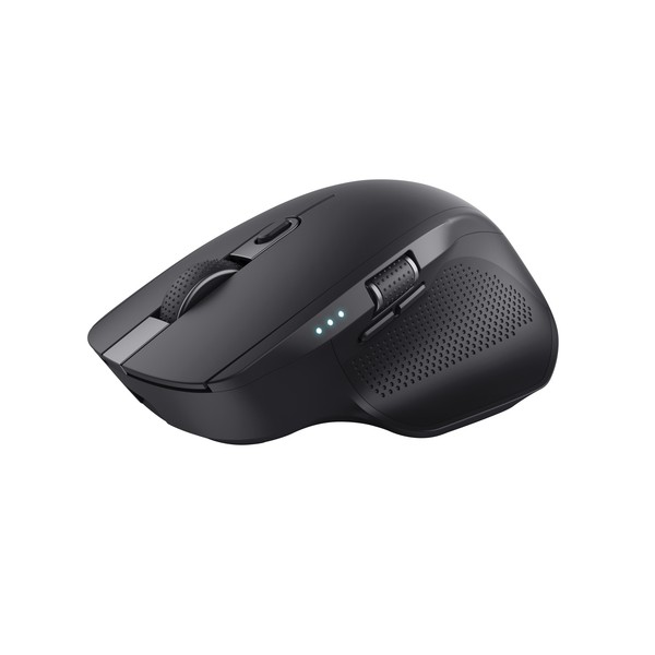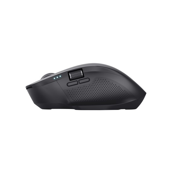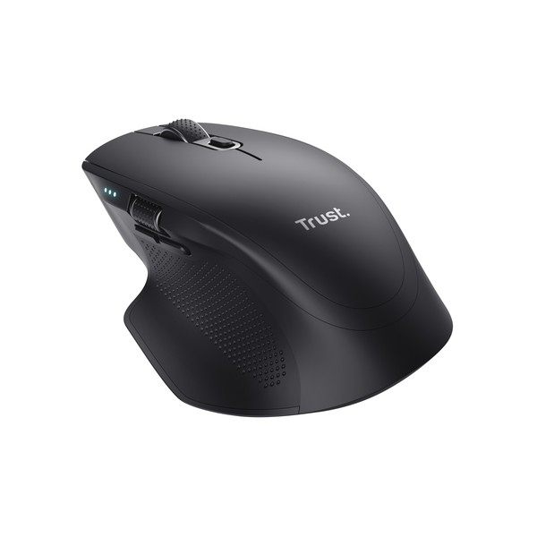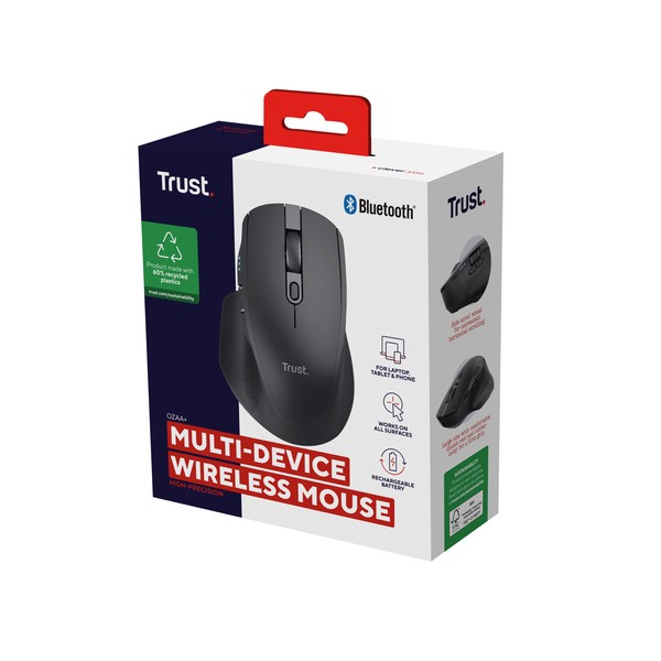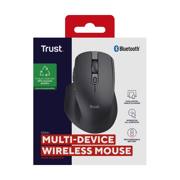 Trust Ozaa+. Fattore di forma: Mano destra. Tecnologia di rilevamento del movimento: Ottico, Interfaccia dispositivo: RF senza fili + Bluetooth, Risoluzione movimento: 3200 DPI, Tipo di pulsanti: Tasti premuti, Numero di tasti: 6, Tipo di scorimmento: Rotella. Alimentazione: Batterie/Cavo. Funziona su tutte le superfici. Colore del prodotto: Nero