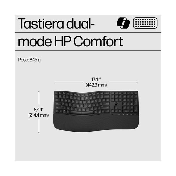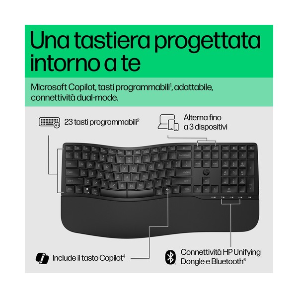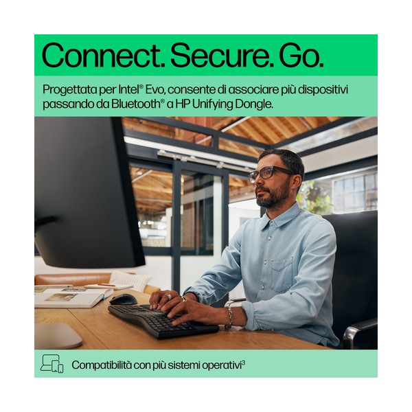 Lavora senza pensieri: questa tastiera dual-mode è progettata per un facile collegamento con più dispositivi. Associala e passa da un dispositivo all'altro mediante il dongle HP Unifying o la connettività Bluetooth®. Progettata per Intel® Evo™ e compatibile con più sistemi operativi[2], questa tastiera è pronta per una produttività fluida e sicura.