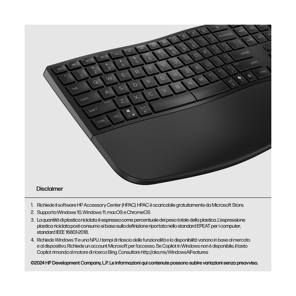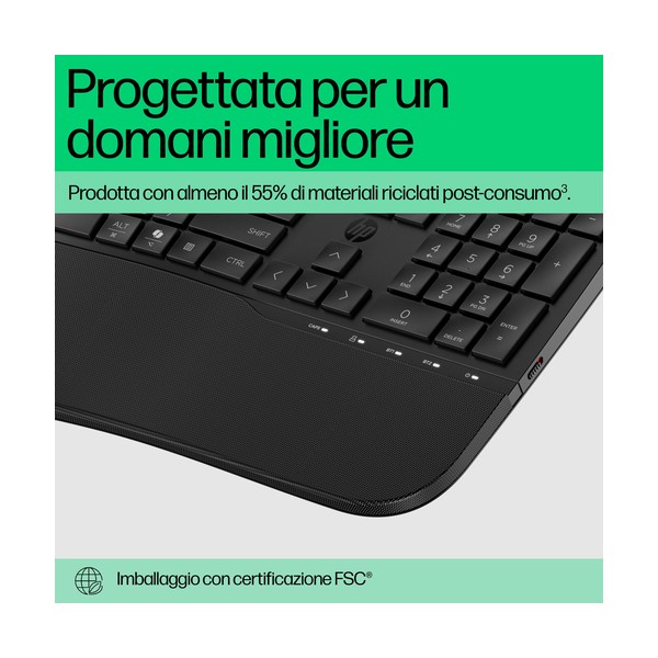 La tastiera HP 680 Comfort Dual-Mode è la scelta ideale per un futuro più sostenibile: è realizzata con almeno il 55% di materiali riciclati post-consumo[3]. Inoltre, con il packaging certificato FSC®, questa tastiera è stata progettata con la massima cura in ogni dettaglio.