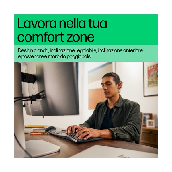 Una tastiera progettata intorno a te Ti serve una tastiera che si adatti al tuo stile? La tastiera HP 680 Comfort Dual-Mode è la scelta ideale per le tue esigenze. Con angoli di digitazione regolabili, tasti programmabili[1] e connettività sicura, questa tastiera offre tutto il comfort, la personalizzazione e la compatibilità di cui hai bisogno.