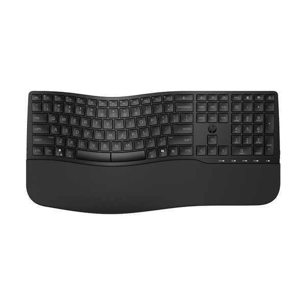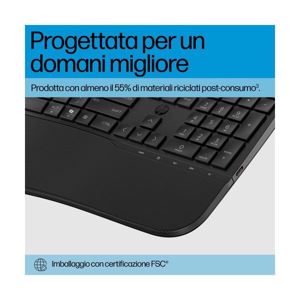HP 685 Comfort Dual-Mode Keyboard. Fattore di forma tastiera: Full-size (100%), Tecnologia di connessione: Wireless, Interfaccia dispositivo: RF senza fili + Bluetooth, Interruttore a chiave per tastiera: Interruttore a chiave a membrana. Riposo del polso. Utilizzo raccomandato: Ufficio. Colore del prodotto: Nero