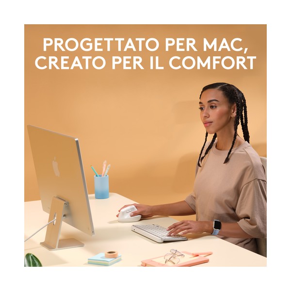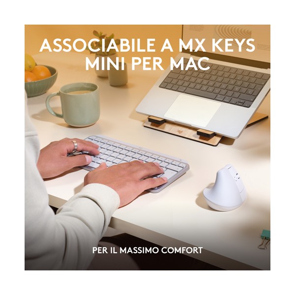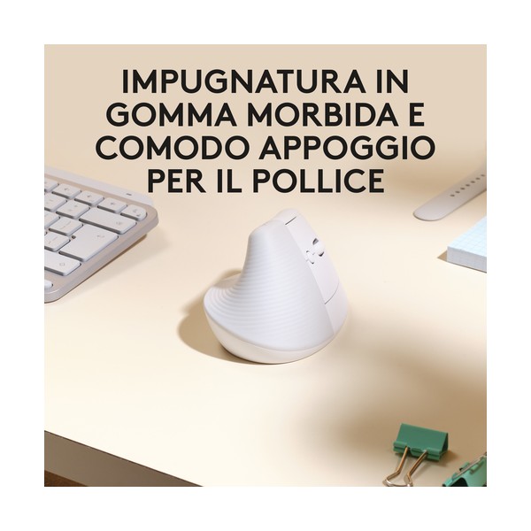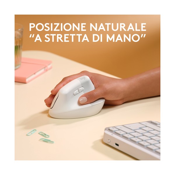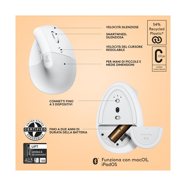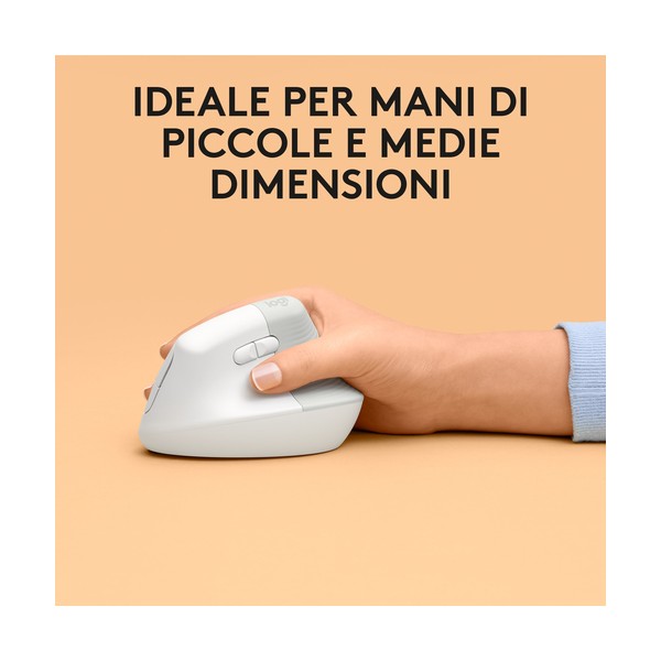 Progettato per Mac.Realizzato per il massimo comfort. Il nostro mouse ergonomico verticale per Mac, progettato per il massimo comfort. Ti presentiamo Lift per Mac Il nostro mouse ergonomico verticale per Mac, progettato per il massimo comfort. Il design e la scienza alla base di Lift per Mac Progettato, sviluppato e testato in Logi Ergo Lab e con il marchio di approvazione dei principali istituiti di ergonomia, Lift per Mac fa sul serio quando si tratta del tuo benessere nello spazio di lavoro. Massimo comfort L’angolo ottimale di 57° di Lift per Mac pone la mano in quella che noi chiamiamo “posizione naturale a stretta di mano”. Questo alleggerisce la pressione sul polso durante il giorno e garantisce una postura più naturale del braccio e della parte superiore del corpo. Appoggia la tua mano comodamente Appoggia la mano su una superficie morbida, con pulsanti facili da raggiungere che ti aiutano a lavorare tutto il giorno senza sollevare un dito. Il mouse è inoltre dotato di un comodo appoggio per il pollice. Rilassati per mantenere la concentrazione tutto il giorno Con la parte superiore del corpo più rilassata, la tua mente può concentrarsi sulle cose che contano davvero. Resta zen dalla mattina alla sera con clic silenziosi e uno scroller silenzioso che registra anche il tocco più leggero. Ideale per mani di piccole e medie dimensioni La silhouette organica di Lift per Mac si adatta come un guanto alle mani di piccole e medie dimensioni, ed è appositamente progettata e modellata dal team di esperti di ergonomia e design di Logitech. Non sai qual è la dimensione della tua mano? Lavora a modo tuo Scopri alcune delle funzionalità che ti consentono di lavorare a modo tuo con Lift per Mac nella tua configurazione Apple. Scorri alla tua velocità Le modalità di scorrimento della SmartWheel rendono ogni operazione di lavoro semplice e silenziosa, sia che tu voglia modificare un testo riga per riga o sfogliare rapidamente un documento. Seleziona le tue scelte rapide Personalizza i quattro pulsanti di Lift per Mac in base alle tue scelte rapide preferite, tramite il software intuitivo Logi Options+. Puoi anche modificare le impostazioni per diverse app, dalla disattivazione del microfono nelle chiamate alla dettatura Voice-to-Text. nei tuoi documenti Passa facilmente da un dispositivo all’altro Connetti fino a tre dispositivi macOS o iPadOS e passa in tutta semplicità dall'uno all'altro utilizzando il pulsante Easy-Switch. Connessione rapida e autonomia prolungata Collega facilmente fino a 3 dispositivi macOS o iPadOS tramite Bluetooth Low Energy e goditi fino a 2 anni di produttività, con una singola batteria AA inclusa nella confezione. La plastica dovrebbe avere più di una vitaPlastica riciclata Le parti in plastica del mouse ergonomico verticale Lift per Mac includono il 54% di plastica riciclata certificata post-consumer, per dare una nuova vita ai materiali plastici provenienti da vecchi apparecchi elettronici e ridurre la nostra impronta di carbonio. Non c'è solo il contenuto della confezione...Packaging sostenibile La carta utilizzata per il packaging di Lift for Mac proviene da foreste con certificazione FSC™ e da altre fonti controllate. Scegliendo questo prodotto, sostieni la gestione responsabile delle foreste del mondo. Questa confezione è realizzata con materiali riciclabili. Ricordati di riciclare! Tutto quello che serve per eliminare l’impronta di carbonioCertificazione zero emissioni Non preoccuparti: l'impronta di carbonio del tuo Lift for Mac è stata ridotta a zero. Questo perché, oltre a progettare in modo sostenibile, compensiamo il nostro impatto residuo sostenendo la silvicoltura, le energie rinnovabili e le comunità colpite dal cambiamento climatico che riducono il carbonio.