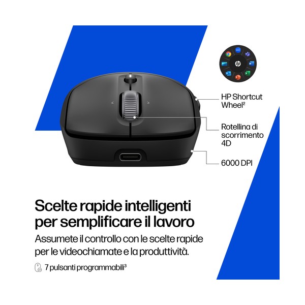 • Semplificate i flussi di lavoro con le scelte rapide per le videoconferenze e la produttività, grazie ad HP Shortcut Wheel,[2] 7 pulsanti programmabili,[3] il pulsante Copilot dedicato[8] e una rotellina di scorrimento rapido in metallo.