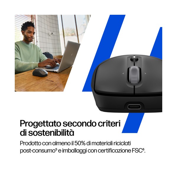 • Il mouse wireless ricaricabile HP è realizzato con almeno il 50% di materiali riciclati post-consumo[5] e viene fornito in un imballaggio con certificazione FSC.[6] Inoltre, scegliendo questo mouse, contribuirete a evitare che oltre 100.000 batterie finiscano nelle discariche di tutto il mondo entro i prossimi quattro anni.[7]