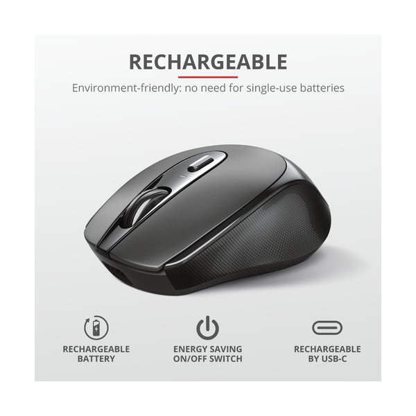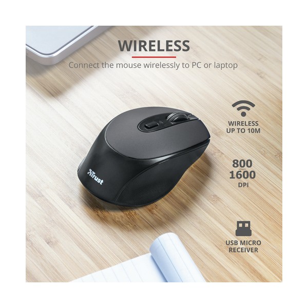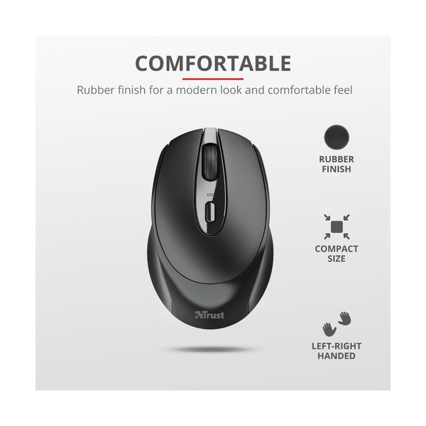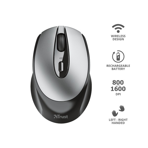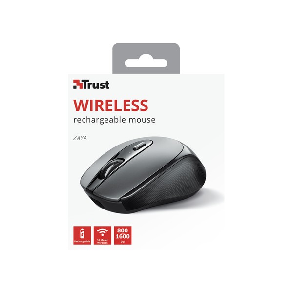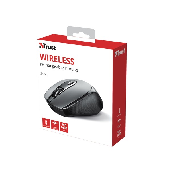 Compatto e pratico Il mouse wireless ricaricabile Trust Zaya è uno strumento pratico che ti semplifica la giornata lavorativa. È provvisto di quattro pulsanti, incluso un pratico commutatore DPI per regolare la velocità del cursore, un microricevitore USB che puoi facilmente riporre nello stesso mouse e batteria ricaricabile. Non dovrai mai più preoccuparti delle batterie.
