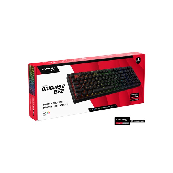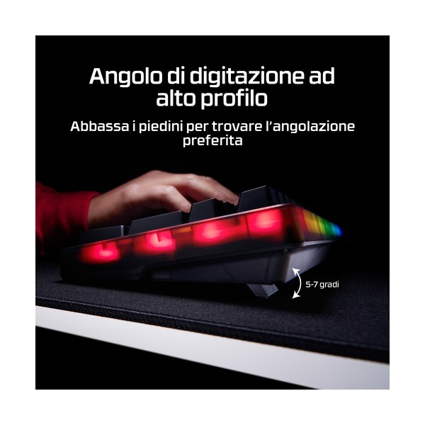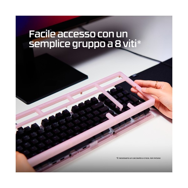 [3] e un ingombro ridotto. Sotto il cofano, troverai un supporto O-ring in silicone e una piastra in policarbonato per assorbire le vibrazioni e ridurre il riverbero per un'esperienza di digitazione silenziosissima. Ma questa tastiera non è solo ideale per scrivere. Con un polling fino a 8K, questa tastiera da gaming comunica i tuoi input al PC fino a 8000 volte al secondo, assicurando l’esecuzione di ogni comando anche nel pieno di una partita ad alta tensione. La scocca ad alto profilo è dotato di piedini ribaltabili che consentono di regolare l’inclinazione per il massimo comfort e un'ergonomia ideale. Questa tastiera è dotata di switch HyperX Linear Red che forniscono un feedback rapido e fluido e una rapida corsa di attuazione di soli 1,8 mm. Gli switch HyperX utilizzano steli POM a mezza parete per offrire stabilità e affidabilità fino a 80 milioni di battute, e puoi sostituirli ogni volta che vuoi. Le basi hot-swap dei tasti sono compatibili con la maggior parte degli switch per tastiere meccaniche a 5 o 3 pin. Origins 2 è completamente personalizzabile con il software HyperX NGENUITY. Puoi facilmente rimappare le funzioni dei tasti, assegnare macro, personalizzare gli effetti RGB e creare fino a 3 profili per la massima funzionalità in qualsiasi situazione.