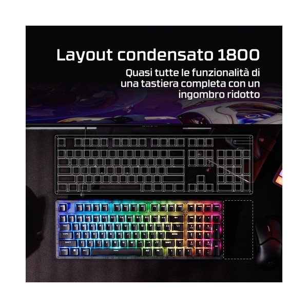 - Recupera il tuo spazio sulla scrivania senza compromessi sulle funzionalità. Con un layout di tipo 1800 compatto, Origins 2 1800 offre tutte le funzioni di una tastiera full-size senza occupare spazio aggiuntivo[4].