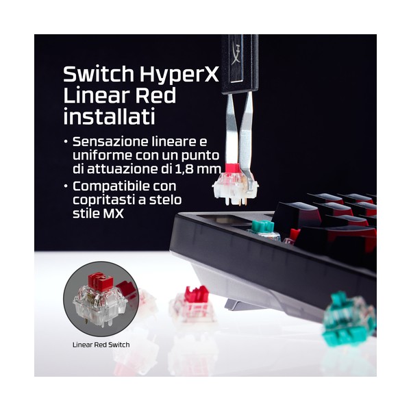 - Gli switch HyperX Linear Red utilizzano steli POM a mezza parete per migliorare la stabilità e il comfort di digitazione. Inoltre, sono lubrificati in fabbrica per garantire una digitazione fluida con un leggero feedback acustico, e sono progettati per una resistenza nominale fino a 80 milioni di pressioni.