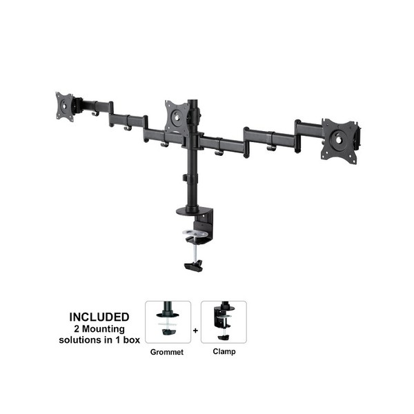 Questo braccio porta monitor NewStar, modello NM-D135D3BLACK consente di collegare due schermi LCD/LED/TFT su di una scrivania con la modalità di fissaggio su piano attraverso vite centrale o morsetto. Utilizzate un braccio porta monitor per sfruttare pienamente le capacità del vostro schermo. Il braccio è facile da regolare in altezza e profondità. È inoltre possibile inclinare lo schermo in senso verticale, orizzontale e farlo ruotare; questo crea la posizione ergonomica di lavoro ideale riducendo il rischio di mal di schiena e al collo. I cavi possono essere collocati sul lato inferiore del braccio. Il supporto NM-D135D3BLACK ha 4 punti di articolazione ed è adatto a schermi fino a 27" (69 cm) con una capacità massima di trasporto di 24 kg (8 kg per ogni schermo). Questo prodotto è adatto per schermi con fori VESA modello 75x75 o 100x100 mm. Per una diversa (più grande) foratura, si può combinare con una delle nostre piastre di adattamento VESA.