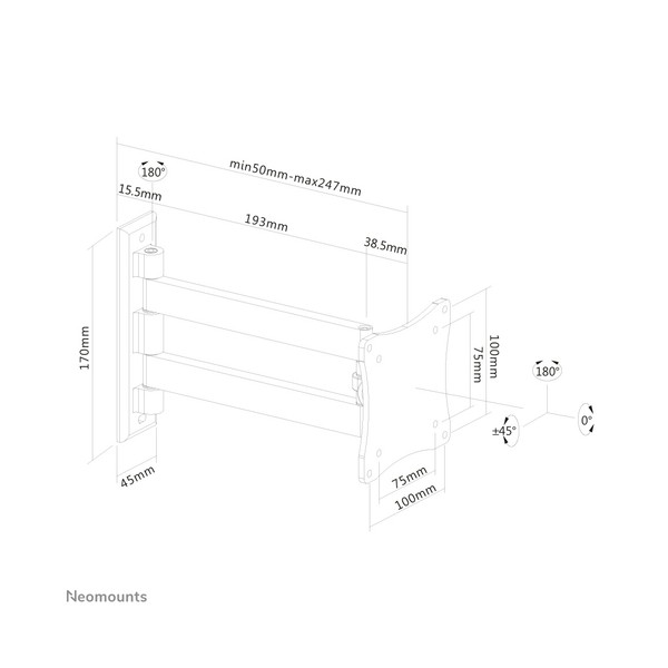 Il montaggio a parete Neomounts by Newstar, modello FPMA-W820 consente di collegare uno schermo LCD/LED/TFT sul muro. Utilizzate un montaggio a parete per sfruttare pienamente le capacità del vostro schermo. Il montaggio a parete è facile da regolare. È inoltre possibile inclinare lo schermo in senso verticale e orizzontale. Questo crea l'angolo di visione ideale riducendo il rischio di mal di schiena e al collo. Il supporto FPMA-W820 ha due punti di articolazione ed è adatto a schermi fino a 27" (69 cm) con una capacità massima di trasporto di 15 kg. Questo prodotto è adatto per schermi con fori VESA modello 75x75, 100x100 mm. Per una diversa (più grande) foratura, si può combinare con una delle nostre piastre di adattamento VESA.
