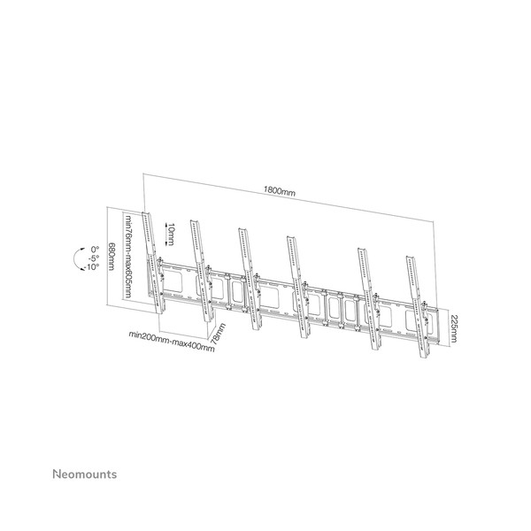 Il supporto da parete Neomounts by Newstar modello NS-WMB300PBLACK per Menu Board è un supporto da parete inclinabile dove poter installare tre schermi piatti fino a 52" (132 cm) in verticale. Questo supporto è un'ottima scelta quando si desidera la massima flessibilità di visualizzazione con lo schermo piatto. La tecnologia Neomounts by Newstars tilt (0 ° / -5 ° / -10 °) consente al supporto di cambiare qualsiasi angolo di visione per beneficiare appieno delle capacità dello schermo piatto. La profondità di questa soluzione è di 7,8 centimetri. Neomounts by Newstar NS-WMB300PBLACK è adatto per 3 schermi fino a 52" (132 cm). La capacità di carico di questo prodotto è di 50 kg per ciascun schermo con fori VESA da 200x200 a 400x600 mm (montaggio verticale) Tutto il materiale di installazione è incluso con il prodotto.