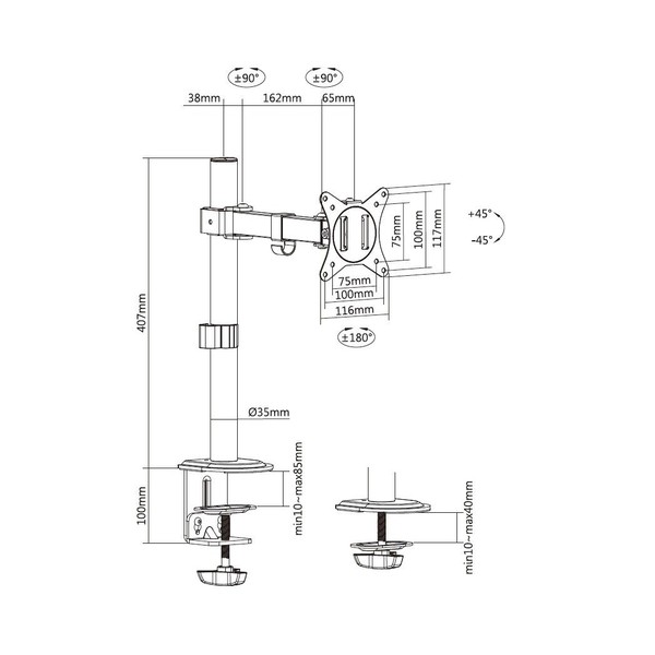 Equip 650156. Montaggio: Morsa, Peso massimo (capacità): 9 kg, Capienza minima dimensioni dello schermo: 43,2 cm (17"), Capienza massima dimensioni dello schermo: 81,3 cm (32"), Compatibilità interfaccia di montaggio (min): 75 x 75 mm, Compatibilità interfaccia di montaggio (max): 100 x 100 mm. Regolazione altezza, Inclinazione: -45 - 45°. Colore del prodotto: Nero