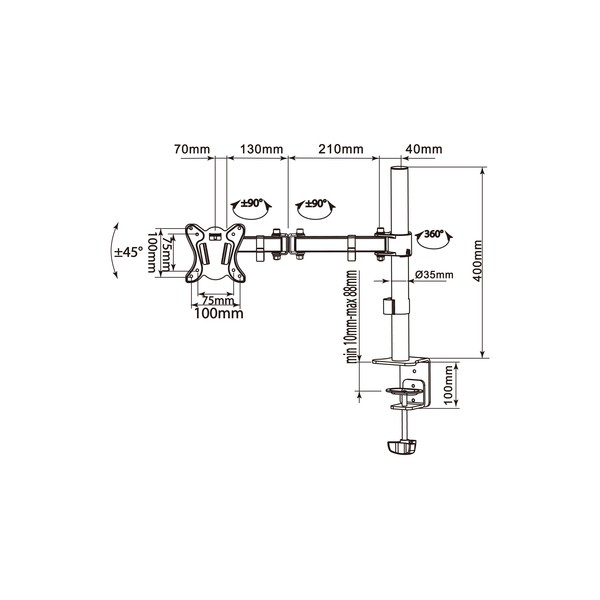 Equip 650151. Montaggio: Morsa, Peso massimo (capacità): 8 kg, Capienza minima dimensioni dello schermo: 33 cm (13"), Capienza massima dimensioni dello schermo: 68,6 cm (27"), Compatibilità interfaccia di montaggio (min): 75 x 75 mm, Compatibilità interfaccia di montaggio (max): 100 x 100 mm. Angolo di rotazione: -90 - 90°, Inclinazione: -45 - 45°. Colore del prodotto: Nero