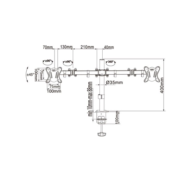 Equip 650152. Montaggio: Morsa, Adatto per: Monitor per computer/TV, Peso massimo (capacità): 16 kg, Capienza minima dimensioni dello schermo: 33 cm (13"), Capienza massima dimensioni dello schermo: 68,6 cm (27"), Compatibilità interfaccia di montaggio (min): 75 x 75 mm, Compatibilità interfaccia di montaggio (max): 100 x 100 mm. Angolo di rotazione: -90 - 90°, Inclinazione: -45 - 45°. Colore del prodotto: Nero