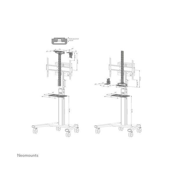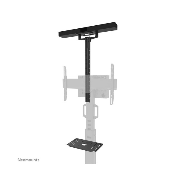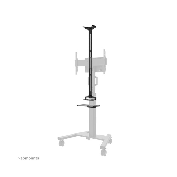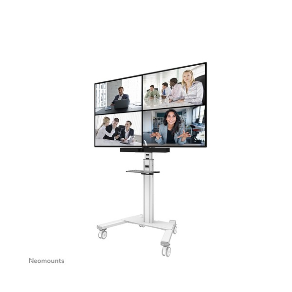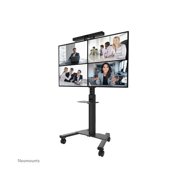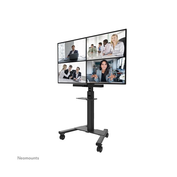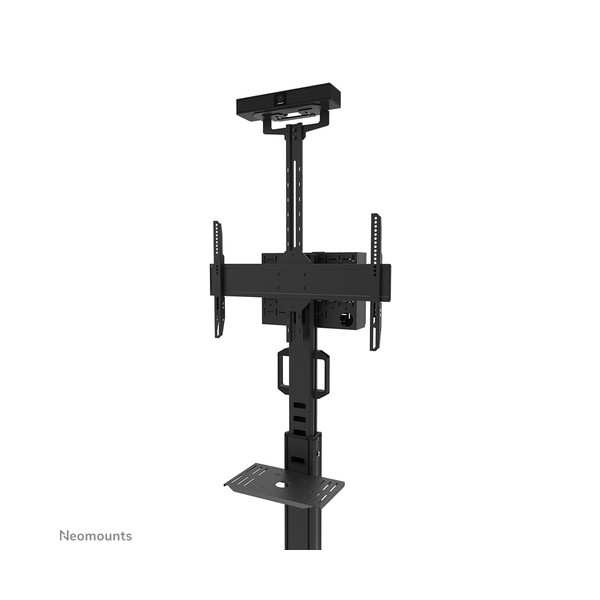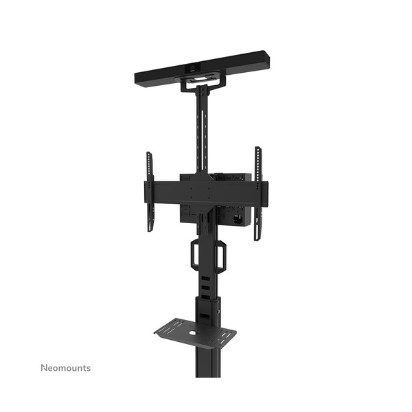 Neomounts AV1-825BL è un kit videobar e multimediale opzionale per la piantana mobile FL50S-825BL1. Il kit consente di installare sul carrello un ripiano separato per cam e dispositivi multimediali. Il ripiano universale per cam può essere installato sia sopra che sotto lo schermo ed è regolabile in altezza e profondità, per adattarsi allo schermo. Inoltre, il ripiano per cam può essere montato sia sul fronte che sul retro del supporto. Il kit comprende anche un adattatore per le barre Bose VB1 e VB-S (anch'esse posizionabili sopra e sotto lo schermo).