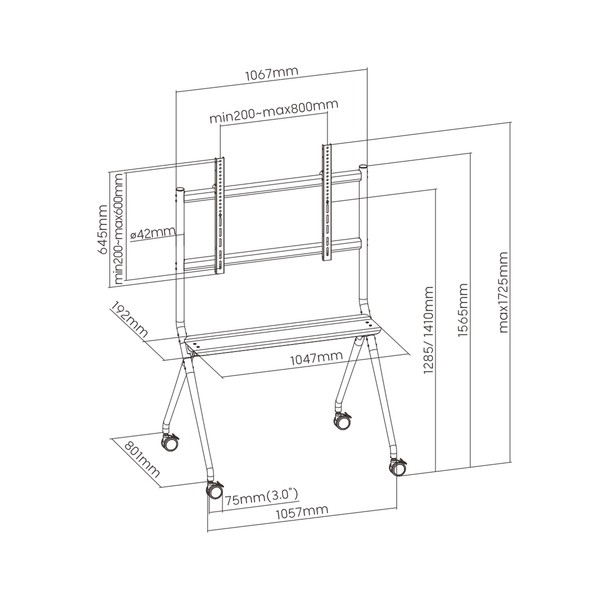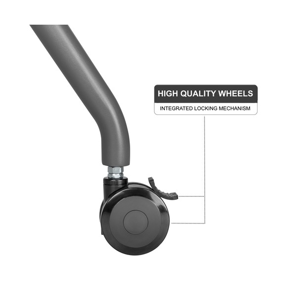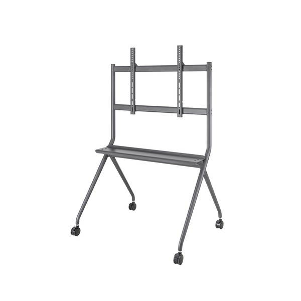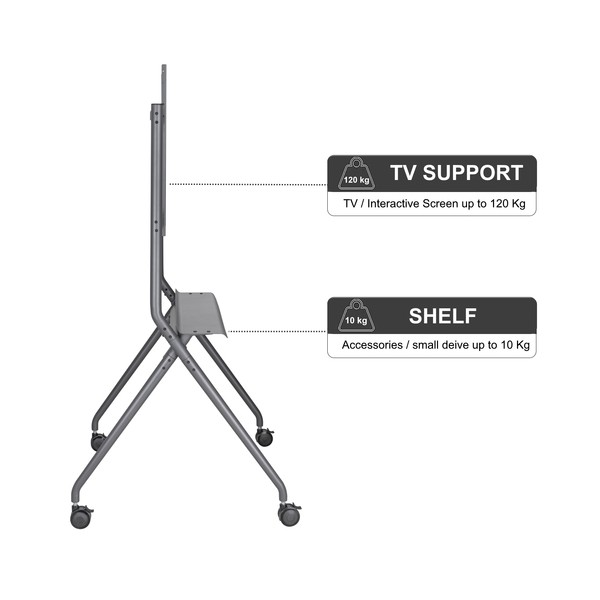 Il carrello TV / Monitor Interattivo mobile è dotato di 4 robuste rotelle a 360° con freno, che consentono di spostare facilmente il carrello TV / Monitor Interattivoda un luogo all'altro; il meccanismo di bloccaggio integrato permette al carrello TV di essere bloccato nella posizione scelta