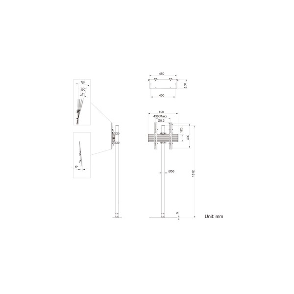 Multibrackets 8939. Peso massimo (capacità): 50 kg, Capienza minima dimensioni dello schermo: 81,3 cm (32"), Capienza massima dimensioni dello schermo: 165,1 cm (65"), Compatibilità interfaccia di montaggio (min): 100 x 100 mm, Compatibilità interfaccia di montaggio (max): 400 x 400 mm. Inclinazione: -6 - 15°. Colore del prodotto: Nero