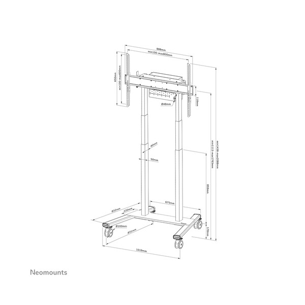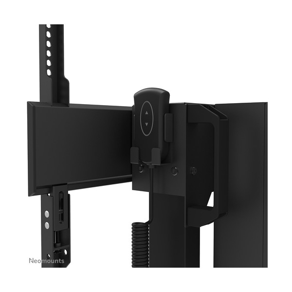 Neomounts by Newstar FL55-875BL1 è un supporto mobile da pavimento per display fino a 100" con una capacità di peso massima di 110 kg. Il carrello ha una regolazione motorizzata dell'altezza di 65 cm (35 mm/secondo), si aziona con un telecomando a filo ed è dotato di un sistema anticollisione per una maggiore sicurezza. Un vano ferramenta ventilato e chiudibile a chiave con apertura per i cavi è incluso e opzionale per l'installazione. Il carrello è dotato di pratiche maniglie e di quattro solide ruote a doppio bloccaggio da 10 cm che consentono di spostare e utilizzare il supporto da pavimento ovunque si desideri. Grazie alle grandi ruote, le soglie o i tappeti non rappresentano una sfida per FL55-875BL1. Il design aperto del passo consente un facile accesso al display (touch) e permette di spostarsi più facilmente intorno agli oggetti. La canalina inclusa, opzionale per l'installazione, nasconde e instrada i cavi dal supporto a pavimento allo schermo. Una pratica staffa per la gestione dei cavi sul retro del carrello assicura uno spostamento facile e sicuro. Inoltre, nella parte inferiore del carrello è disponibile uno spazio con fori di fissaggio per installare una ciabatta elettrica. Il supporto da pavimento è imballato parzialmente preassemblato, per garantire un'installazione facile e veloce. Il display può essere fissato bloccando le staffe con un lucchetto (non incluso). Inoltre, l'FL55-875BL1 è imballato in modo compatto per ottimizzare il trasporto e lo stoccaggio. Il kit videobar e multimedia AFL-875BL1 è disponibile come opzione e consente di installare sul carrello un ripiano separato per cam e dispositivi multimediali. Il kit include un adattatore per la barra Logitech Rally (Mini). Inoltre, il ripiano multimediale è adatto all'installazione, ad esempio, del Logitech Tap.