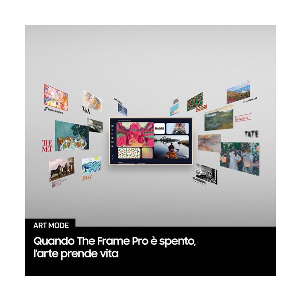 Grazie alle cornici personalizzabili, potrai modificare l'aspetto di The Frame Pro in base alle tue preferenze personali. Con tante opzioni disponibili, troverai sempre il colore più adatto al tuo ambiente o alle opere d'arte mostrate di volta in volta. Inoltre, linstallazione è davvero semplicissima: basta agganciare l'elegante cornice magnetica ai bordi del televisore.