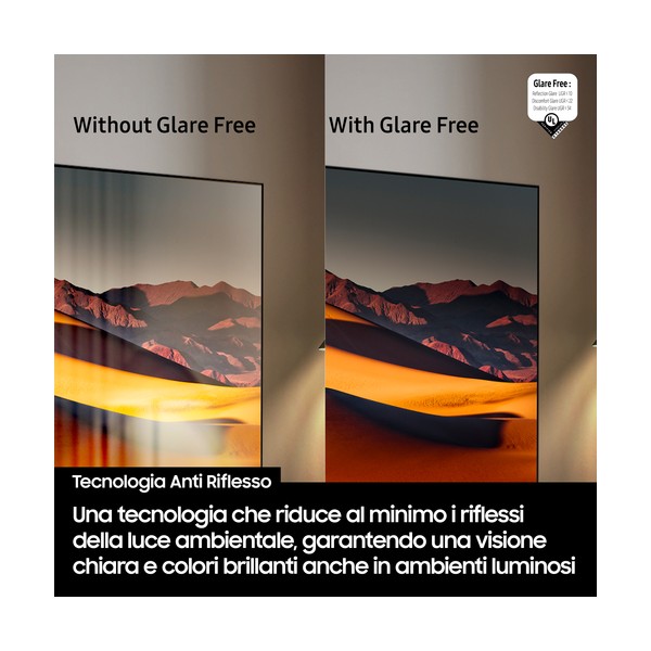 La nostra tecnologia Glare Free riduce al minimo i riflessi anche negli ambienti domestici con luci artificiali particolarmente intense. Da oggi potrai vedere perfettamente le immagini sullo schermo e guardare i tuoi contenuti senza riflessi fastidiosi.