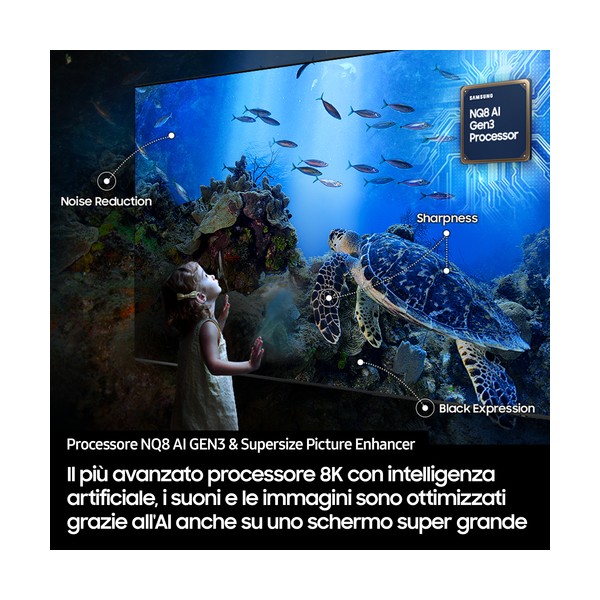 Qualità senza compromessi grazie al processore AI Samsung più all'avanguardia di sempre. Grazie al supporto di 768 reti neurali AI, riproduce suoni e immagini con una qualità senza precedenti. Questo televisore 8K è in grado di offrire prestazioni semplicemente straordinarie con qualsiasi contenuto.