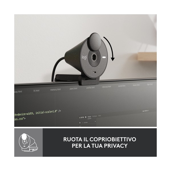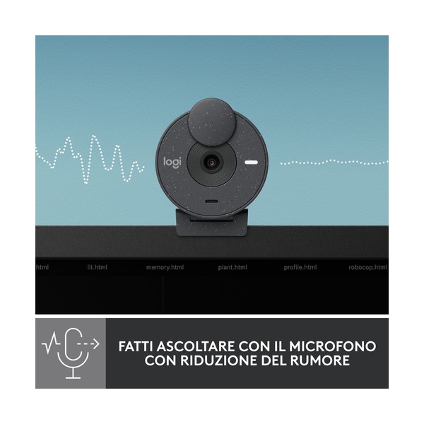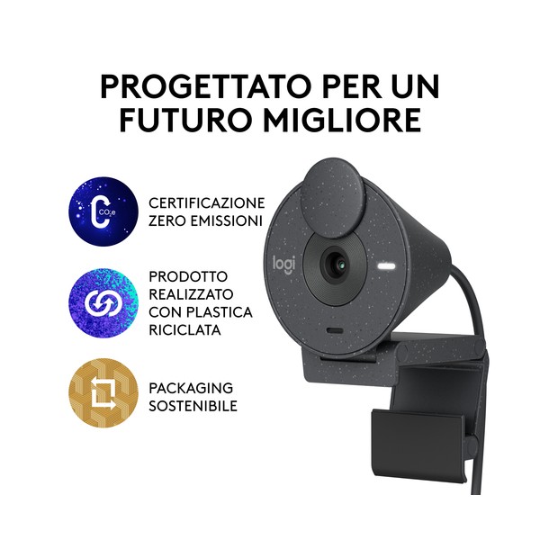 Riunioni di qualità superiore con Brio 300. Mostra il meglio di te grazie all’alta risoluzione e alla correzione automatica dell’illuminazione. Apri e chiudi il copriobiettivo con una semplice rotazione. Brio 300 funziona con le principali piattaforme per riunioni ed è realizzata con il 48% di plastica riciclata, che le conferisce un’elegante finitura screziata.