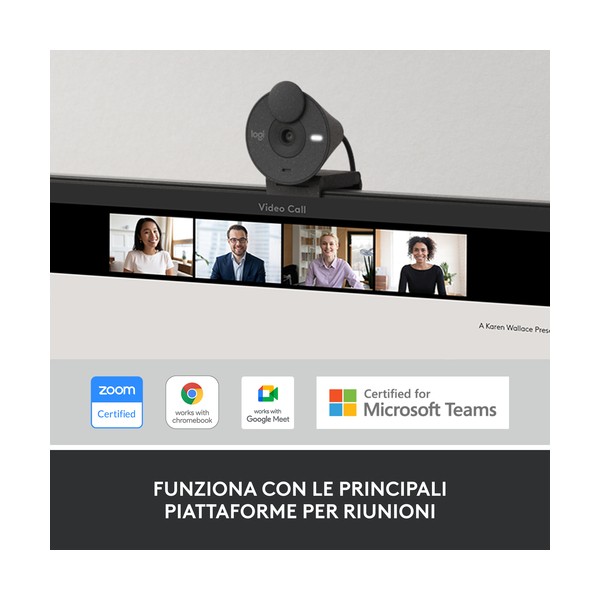 Realizzata per le Riunioni: Brio Webcam 300 è compatibile con la maggior parte delle piattaforme di videoconferenza e certificata per Zoom, Microsoft Teams e Google Meet